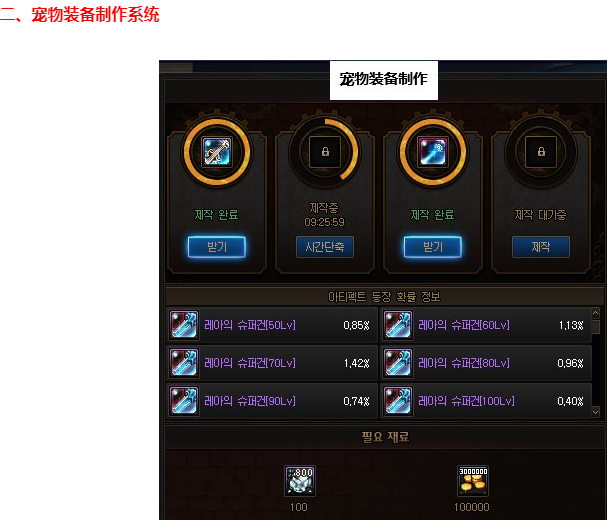 制作宠物装备制作时、可以根据几率不同获得50Lv以上的稀有〜神器宠物装备,制作时间越长获得的稀有装备的几率就越高,制作过程中可以通过消耗宠物灵魂来进行加速。